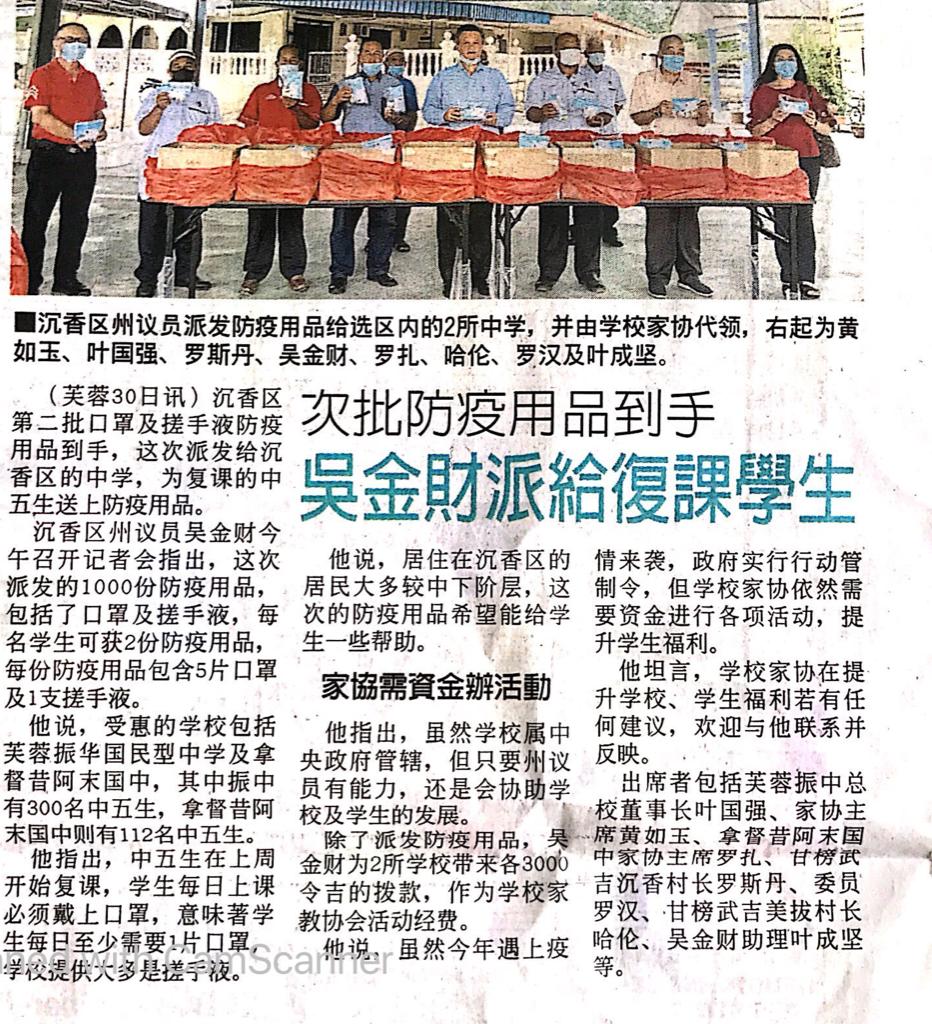 Tajuk :Seremban:YB Tuan Ng Chin Tsai mengedarkan sumbangan pelitup muka dan juga pembersih tangan kepada 2 buah sekolah menengah di Temiang.