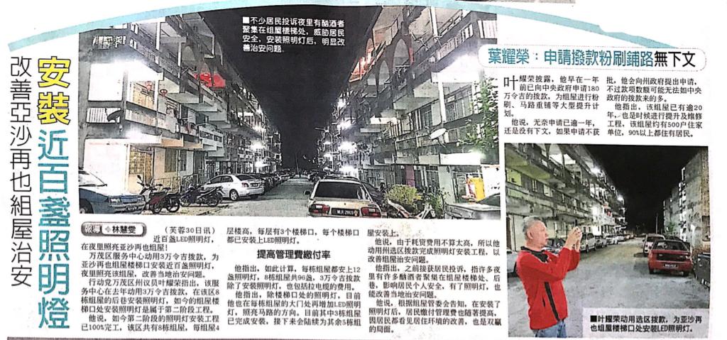 Tajuk :Seremban:YB Tuan Yap Yew Weng telah turun ke Flat Rasah Jaya untuk memantau proses kerja pemasangan lampu lampu LED di sekililing blok rumah flat tersebut.