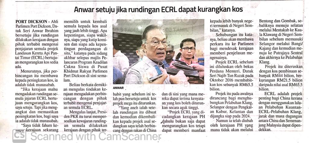 Tajuk :Anwar setuju jika rundingan ECRL dapat kurangkan kos