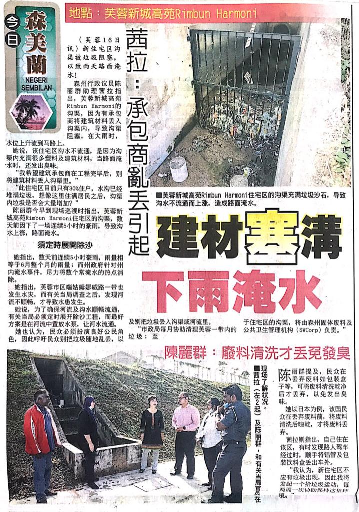 Tajuk :Seremban:YB Puan Nicole Tan Lee Koon telah turun memantau kerja pembersihan longkang besar di tepi jalan Rimbun Harmoni, S2 Heights pada pagi ini bersama pihak MPS dan pihak SWM.