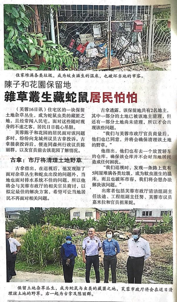 Tajuk :Seremban:YB Tuan Gunasegaran bersama YB Puan Nicole Tan Lee Koon telah mengadakan lawatan ke tapak aduan tanah rezab di Jalan Seroja 23 Taman Tan Chee Hoe yang dikatakan telah mendatangkan gangguan,semak samun,saliran yang tidak teratur dan terdapat ancaman binatang berbisa.