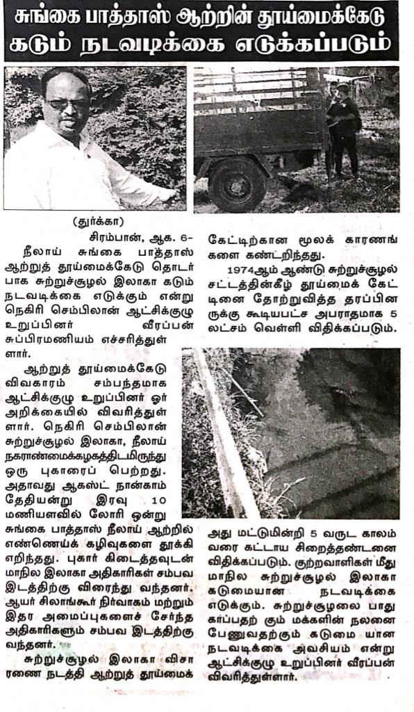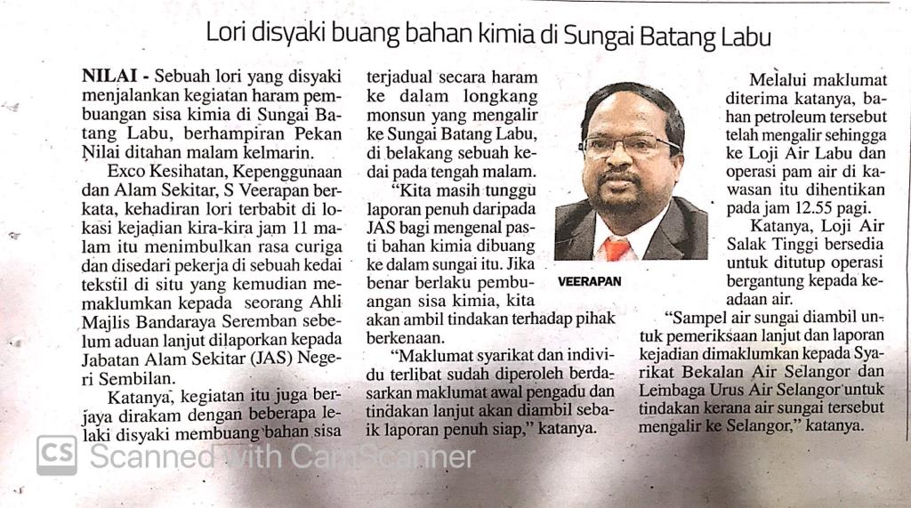 Tajuk :Seremban:Jabatan Alam Sekitar Negeri Sembilan (JASNS) menerima aduan pencemaran membabitkan sebuah lori yang membuang sisa minyak ke dalam Sungai Batang Nilai.