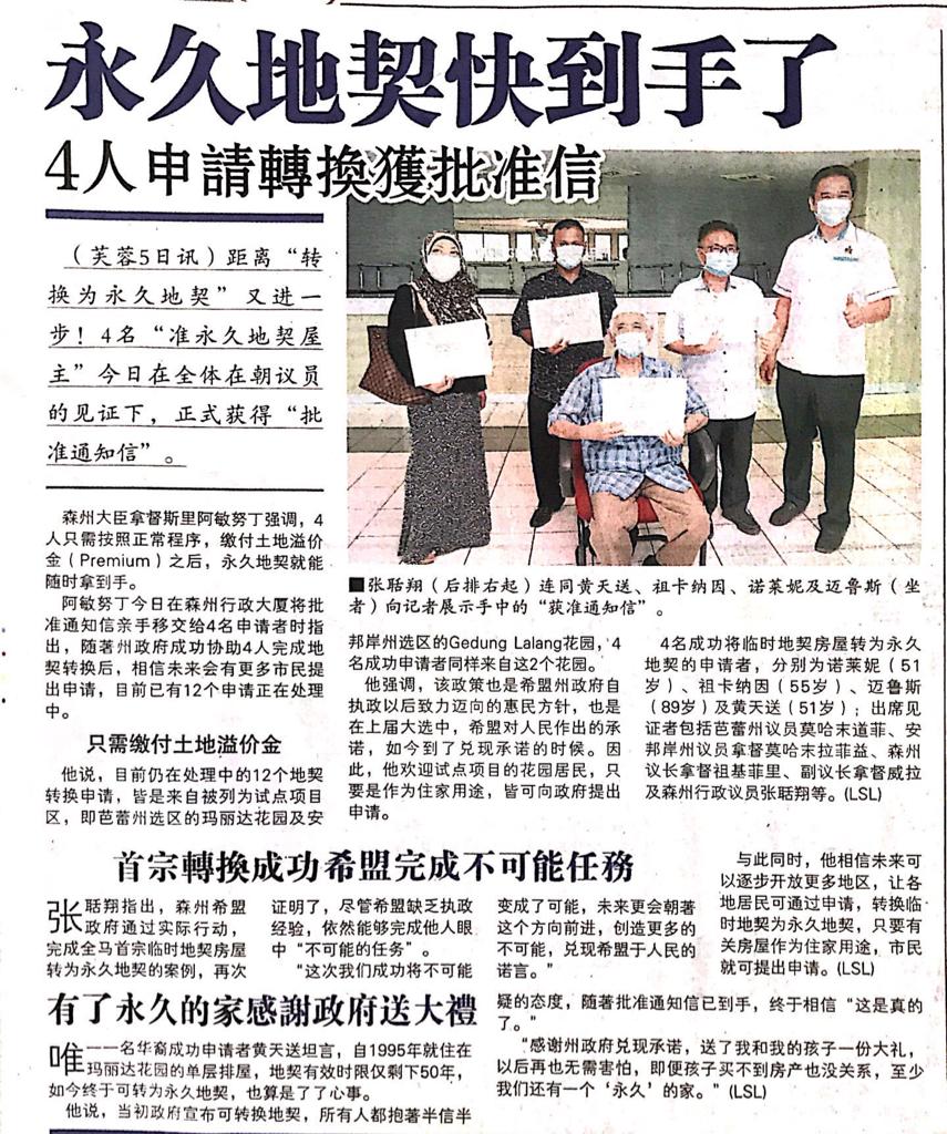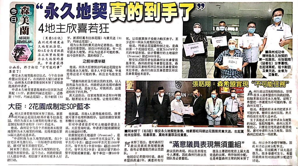 Tajuk :Seremban:Kerajaan Negeri telah meluluskan empat (4) permohonan penukaran status tanah kediaman daripada pajakan kepada hak milik kekal.