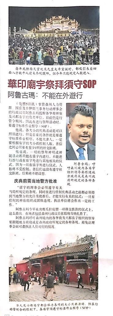 Tajuk :Seremban:YB Tuan Veerapan menyatakan bahawa rumah ibadat bukan islam boleh mengadakan majlis sambutan perayaan dengan syarat perlu mengikut SOP yang telah ditetapkan supaya dapat mencegah penyebara Covid-19.