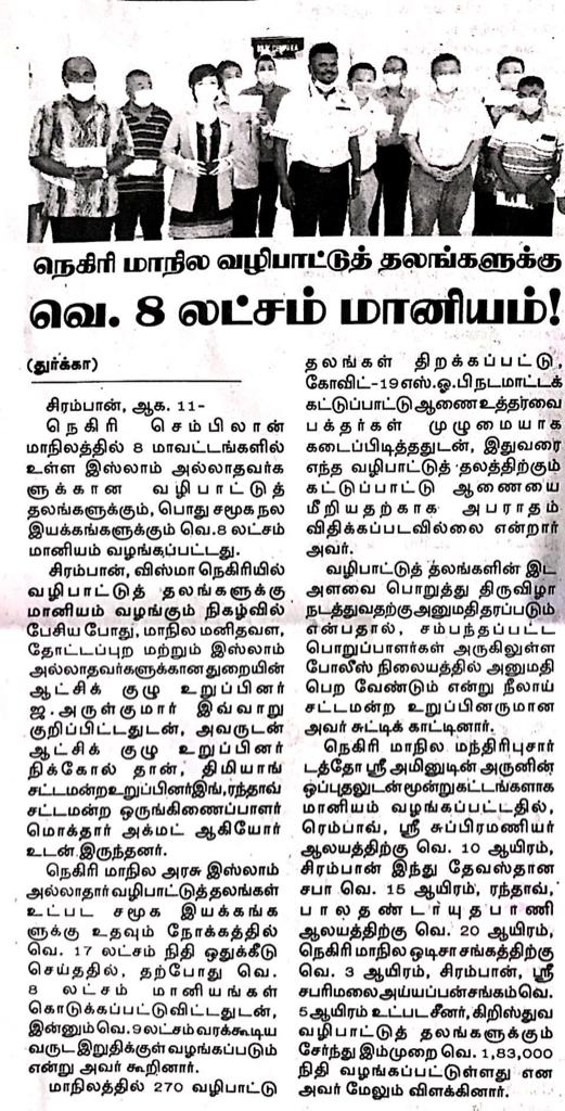 Tajuk :Seremban:YB Tuan Arul Kumar Jambunathan,YB Puan Nicole Tan Lee Koon dan YB Tuan Ng Chin Tsai telah menghadiri Majlis Penyerahan Peruntukan kepada Tokong dan Kuil